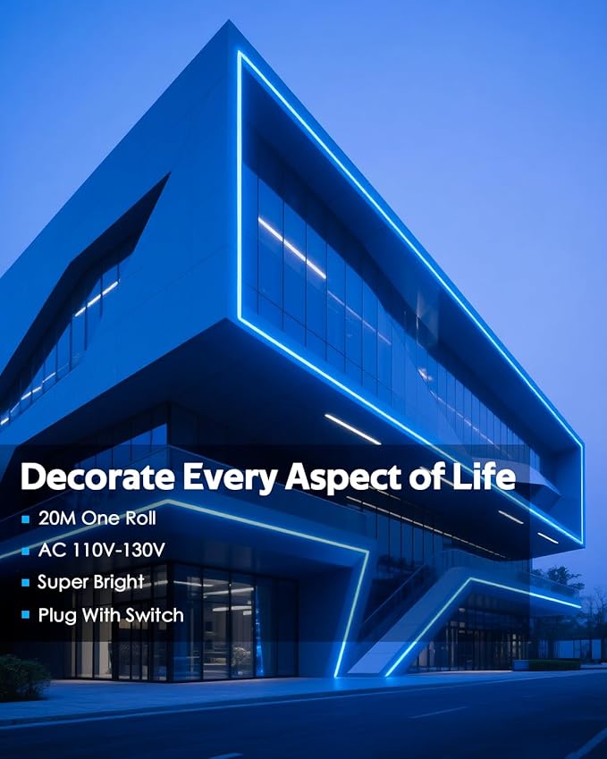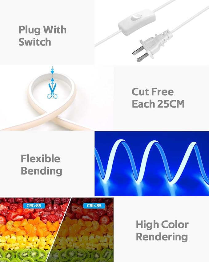 - 【Uniform Luminescence, Plug & Play】AC 110-130V Input, High Density 288 LEDs/M, Total 5760 LEDs/20M, 8W/M.16.4FT blue led strip light plug comes with an switch, plug and play, onvenient for you to use. Compared with low voltage LED strips, high voltage LED strips will not show brightness difference in the whole strip, which is ideal for super bright decorative lighting suitable for home.