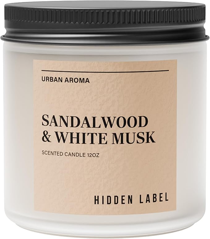 Hidden Label Sandalwood & White Musk Scented Candle - 12oz Natural Soy Non Toxic 70H Burn Time 2 Wick Aromatherapy Candle for Home Decor,Stress Relief & Relaxation