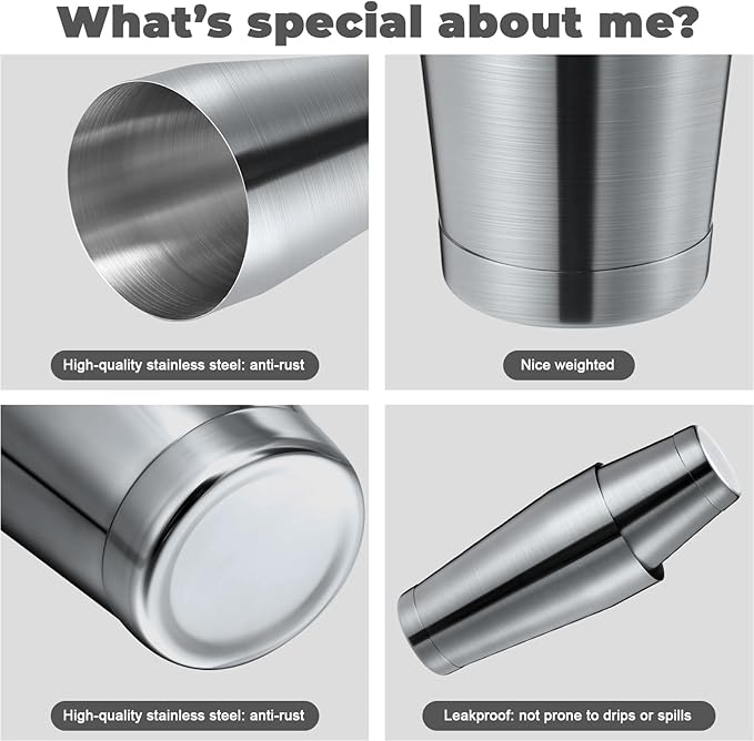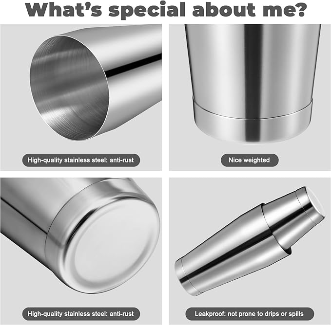 - Leak Proof Boston Shaker: the stainless steel shaker has been tested to be more waterproof than glasses shakers, less likely to leak, this Boston shaker set is not easy to freeze, drip or spill as you pour your drink