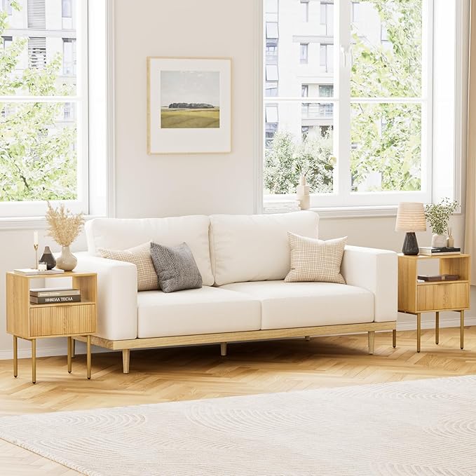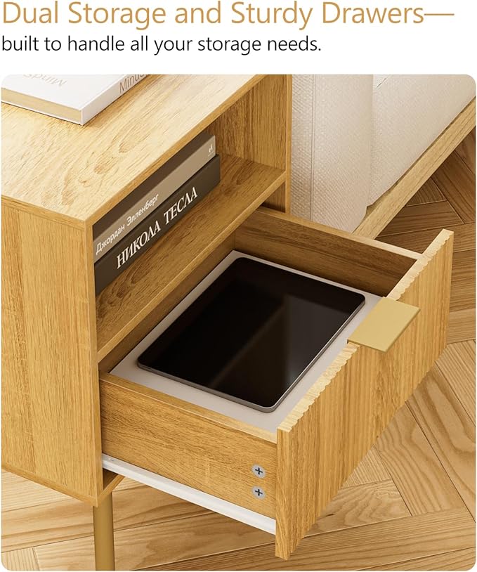 Masupu Night Stand,Mid-Century Modern Bedside Table with Storage Drawer and Open Wood Shelf,Small Gold Frame Side Table for Bedroom,Living Room, Natural