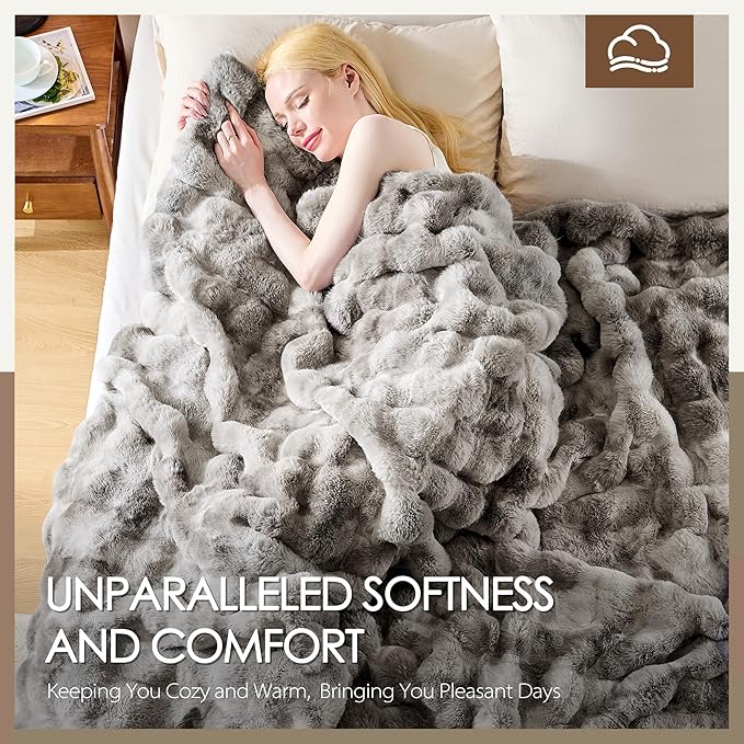 - LUXURIOUS COZY FAUX RABBIT FUR FABRIC: This bubble blanket is crafted from 780GSM plush faux rabbit fur fabric for warmth and comfort, and 220GSM crystal velvet fabric lining for silky softness. The furry faux rabbit fur throw blanekt feel as soft as clouds and gently wrap you like a warm embrace, giving you a comfortable double-sided experience, making you feel cozy all winter long.