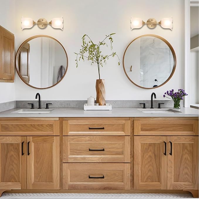 2-Lights Gold Wall Sconce with Frosted Glass Shades Modern Mid Century Bathroom Vanity Wall Light Fixtures Industrial Brushed Brass Wall Lamp for Bedroom Mirror Living Room Restaurant