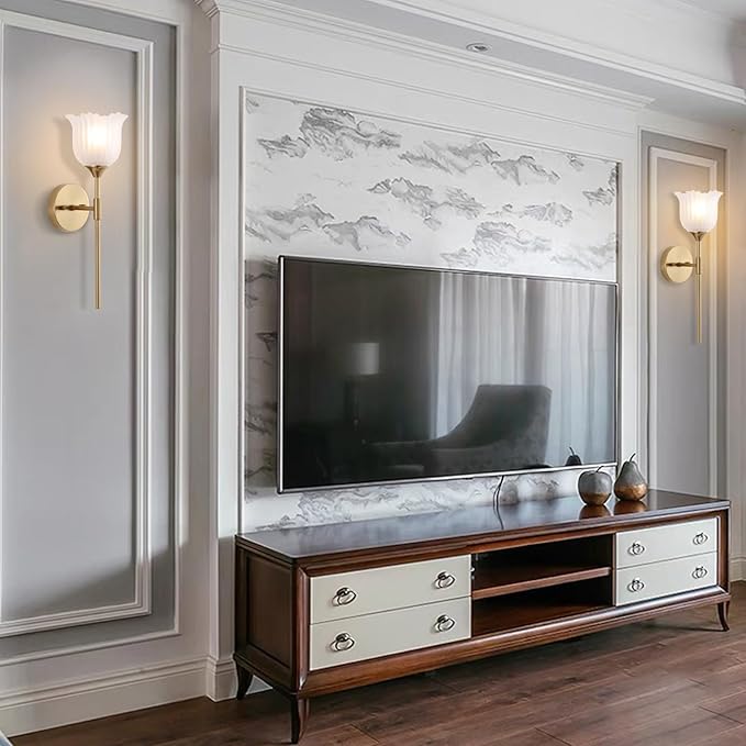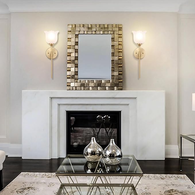 - 【Perfect Size】Wall light size:18.1'' L x 7.68'' W;Back plate size: 4.72"(D);Frosted glass lampshade size:5.9"(D)*4.72"(H). The 2 Pack gold light fixture is Hard-wired,no switch or plug on the fixture itself. With USA standard installation back plate,easy to install.