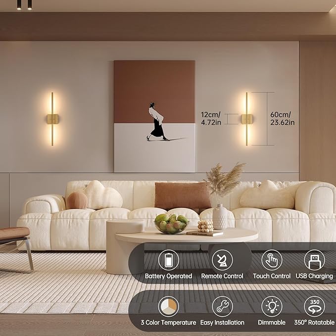 Battery Operated Wall Sconce Set of 2, 8000mAh Wireless Wall Sconces, 3000K-6000K Dimmable, 350°Rotate, Indoor Wall Lights for Bedroom Living Room Bathroom, Gold, 23.6 Inch