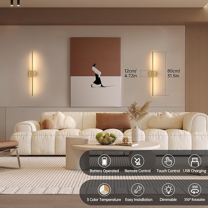 Battery Operated Wall Sconce Set of 2, 10400mAh Rechargeable Wall Sconces, 3000K-6000K Dimmable, 350°Rotate, Indoor Wall Lights for Bedroom Living Room Bathroom, Gold, 31.5 Inch