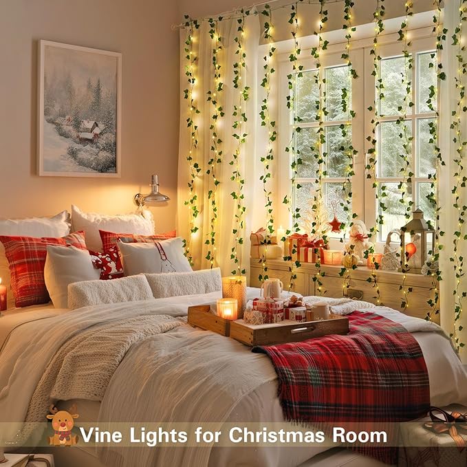 - 8 Lighting Modes & Remote Control: Artificial Ivy vines with fairy lights have 8 amazing lighting modes with adjustment, suitable for romantic bedroom or lively parties. Point the remote at Ivy vines and you can easily control the brightness and flashing mode. The remote-controlled ivy garland with fairy lights feature 2/4/6/8 hour auto-off timing function for energy efficiency. These Ivy Curtain Lights can perfectly match any atmosphere or moment you want.
