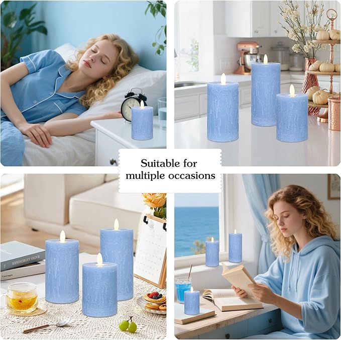- SET INCLUDES: Three rustic blue LED pillar candles in graduated sizes with realistic flickering flame effect and remote controlNautical
