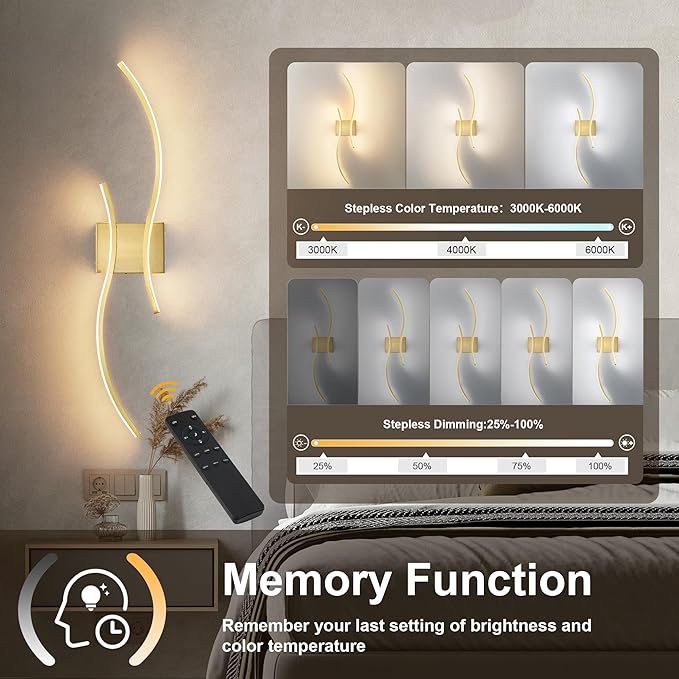 - Adjustable Colors & Brightness,Memory Function: You can choose different color temperature modes (3000K-6000K) through the remote control according to your needs, and adjust the brightness you want (20%-100%) . The color temperature and brightness can be infinitely adjusted. Memory function can remember your last color and brightness setting. So you don't need to adjust the color and brightness every time.In addition, the remote control also comes with a night light and timing function, allowing you to read without disturbing your partner's sleep