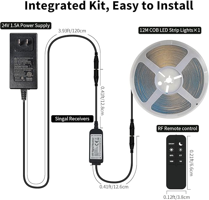 - What You Will Receive: 40FT LED strip light × 1, RF remote control × 1 (requires 2 AAA batteries, not included), 24V power adapter × 1, signal receiver × 1 and 1 connector × 1, etc. There is no need to purchase other accessories, and it can be directly installed and used. If you encounter problems during the installation process, you can seek the guidance and suggestions of MILADALED professional technicians!
