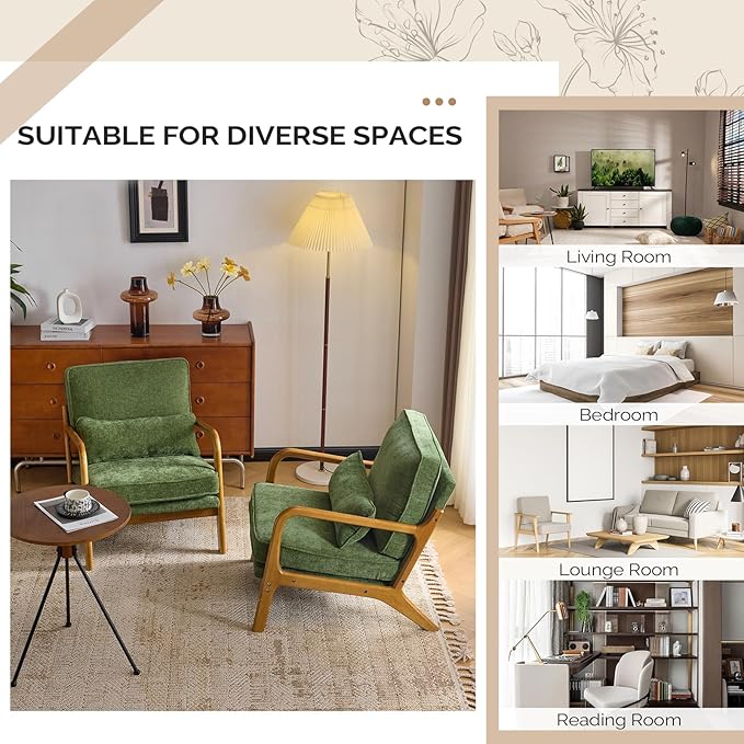 VINGLI Chenille Mid-Century Modern Accent Chair Set of 2, Cute Reading Arm Chair with Cushion & Lumbar Pillow & Solid Wood Frame for Lounge, Living Room, Reading Room, Bedroom, Olive-Green