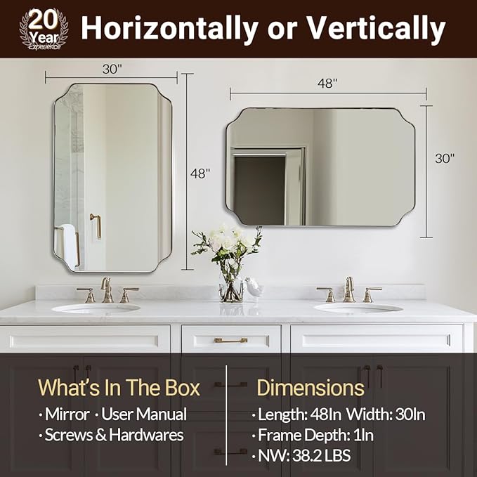 - 【Easy and Secure Installation】: 4 pre-installed D-Rings, along with all necessary hardware and clear installation instructions, ensure a hassle-free setup process. For any missing hardware, simply reach out to us for prompt assistance. Due to its weight, we recommend having 2 people install this heavy bathroom vanity mirror for over sink