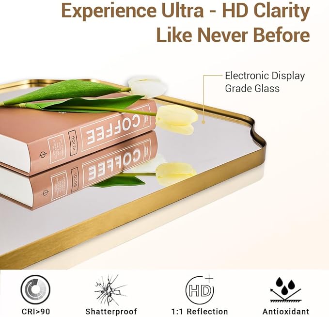 - 【Aesthetic Scalloped Edge Design】: (N.W:38.2LBS). Elevate your bathroom decor with our brushed gold rectangle scalloped mirror boasting a stylishly sculpted frame. Crafted with intricately curved rounded edges, each corner showcases a captivating concave scalloped arc, ensuring an eye-catching addition to any space