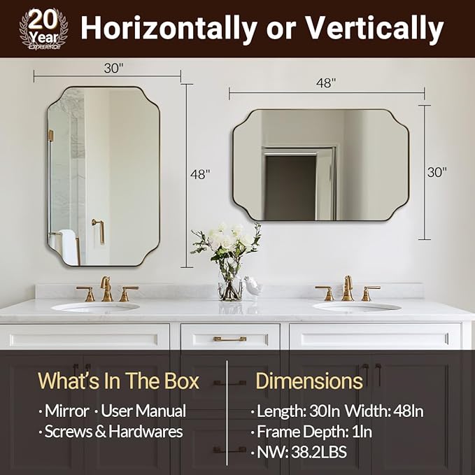- 【Easy and Secure Installation】: 4 pre-installed D-Rings, along with all necessary hardware and clear installation instructions, ensure a hassle-free setup process. For any missing hardware, reach out to us for prompt assistance. Due to its weight, we recommend having 2 people install this heavy antique brass mirror for bathroom