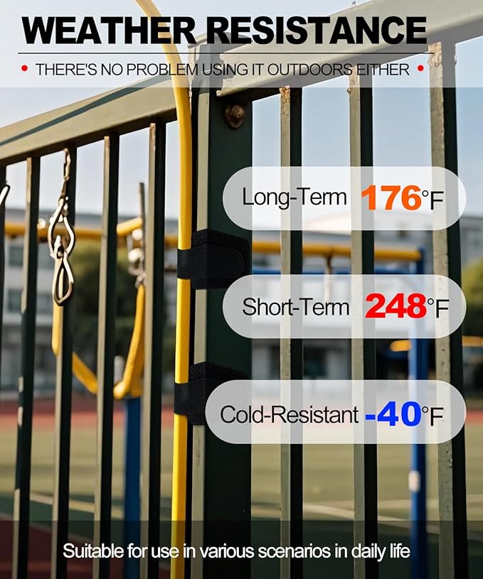 - Weather Resistance】The hook and loop cable ties have excellent weather resistance and outstanding waterproof performance, maintaining stable adhesion in damp environments such as kitchens and bathrooms. The cable ties are cold-resistant down to -40℉(-40℃), can withstand short-term temperatures up to 248℉(120℃), and have a long-term temperature resistance of 176℉(80℃), making them suitable for use in a variety of everyday scenarios.