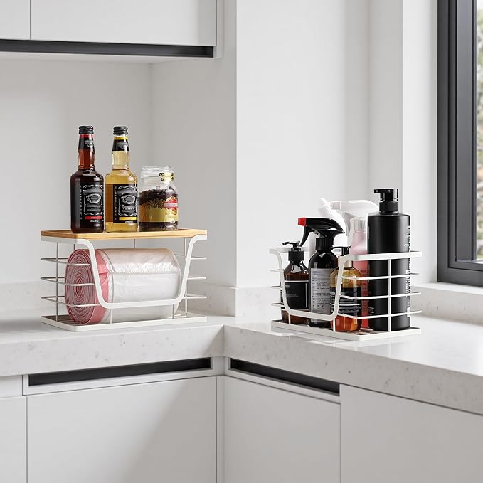 ALOCEO 2 Pack Extra Large Trash Bag Holder with Bamboo Top, Wall Mount Stainless Steel Organization and Storage for Kitchen Sink, White