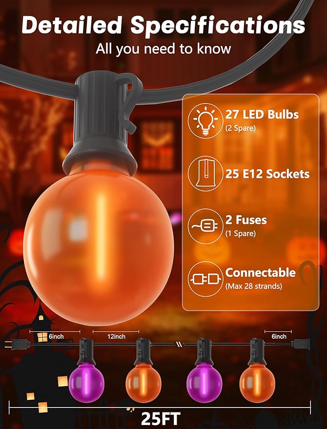 - 25ft Connectable String Lights: G40 Halloween string lights come with 27 LED frosted orange and purple globe lights(2 Spare). Each bulb is 12inch apart. Each set of Halloween lights comes with male and female plugs, supporting end-to-end connection of up to 28 light strings, making it easy to cover large areas