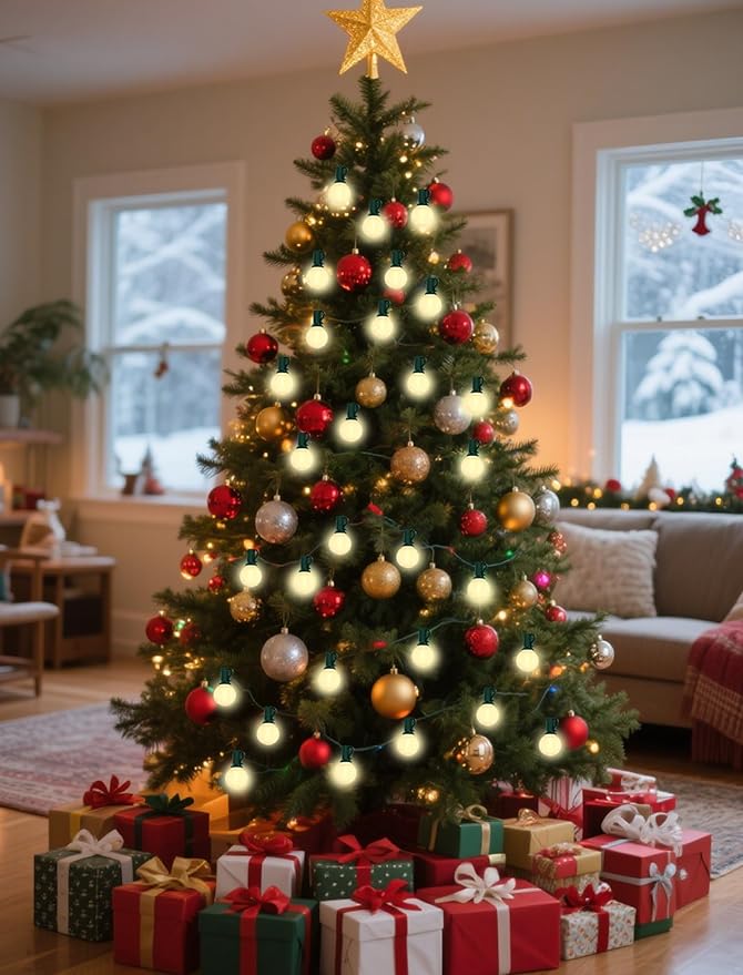 - Easy to Install & Versatile Use: Outdoor christmas string lights socket has a clip on the side. Simply hang or wrap round Christmas decorations bistro lights along rooflines, fences, trees, stair railings or patios. Hanging patio lights perfect for Christmas decorations, wedding receptions, garden parties, or cozy indoor setups, to transform your space into a warm, festive atmosphere.
