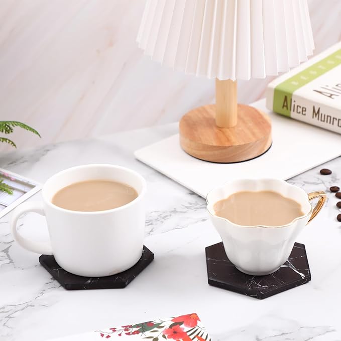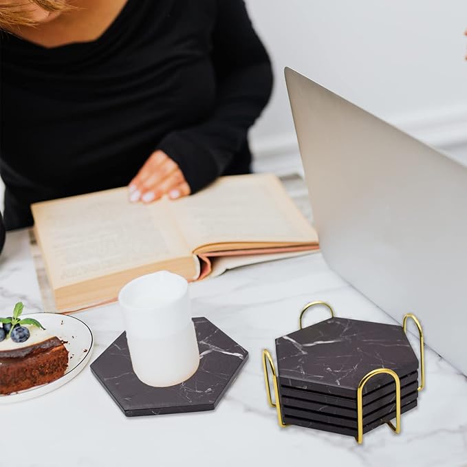 Absorbent Hexagon Black Marble Coasters for Drink with Gold Holder and Cork Base Set of 6 Decorative Tabletop Protection for Bar Kitchen Home and Dining Room