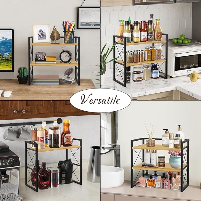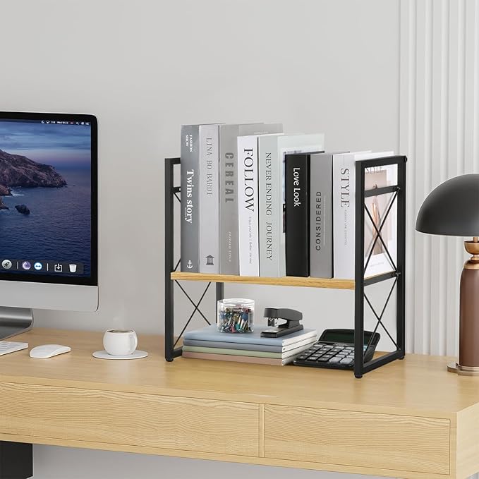 - 【Space-Saving Design】: This 2-tier desktop shelf is designed to help you maximize space on your desk or office desktop. It's perfect for storing books, office supplies, spice vases, plants, toiletries, towels, and cherished keepsakes. Say goodbye to clutter and hello to a tidy workspace in your office, kitchen, bathroom, or bedroom.