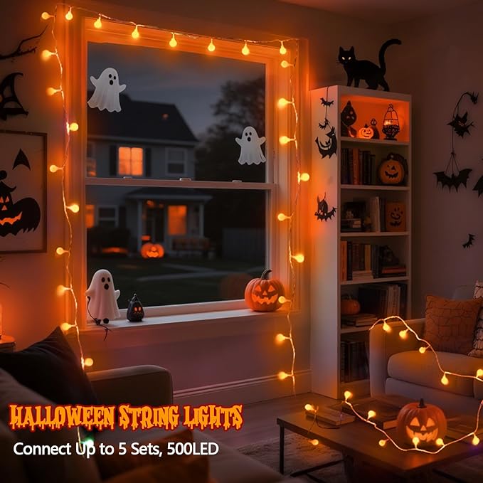 - [Halloween Decorations]The connectable sparkling orange string lights feature 100 LEDs and measure 43ft in total (33ft light string with an additional 10ft lead wire). These Halloween lights string perfectly complement the spooky and joyful Halloween atmosphere. Whether decorating bedroom, home, room, patio or party, these orange Halloween lights light up the festive magic in an instant