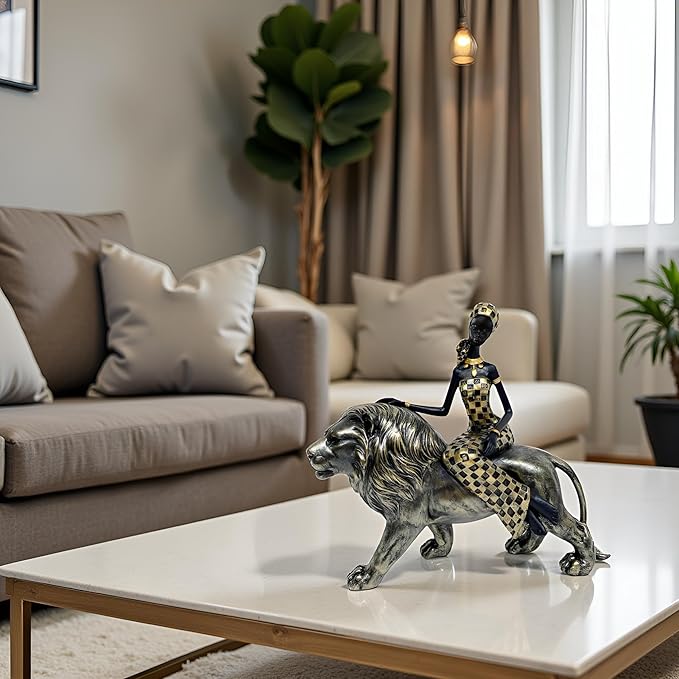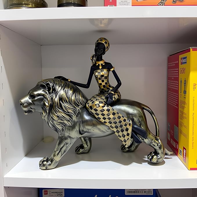 African Lion Tribal Lady Sculpture, African Design Figurines with Tribal Totem,Desk Room Home Decor, Animal and Women Decor Art Sculptures