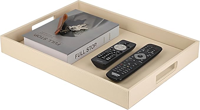 HofferRuffer Rectangle Serving Tray with Hole Handles for Coffee Table, Breakfast, Tea, Food, Butler - Countertop, Kitchen, Vanity Serve Tray, 16.2 x 12.2 x 2 inches, Faux Leather (Dark CreamWhite)