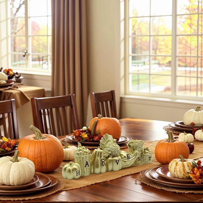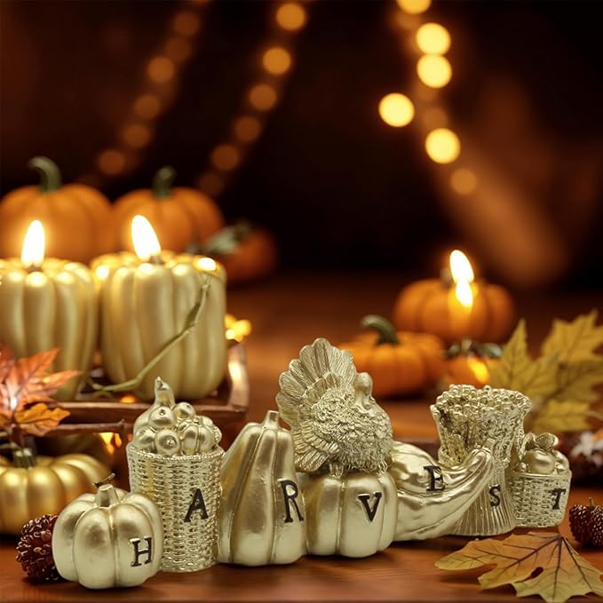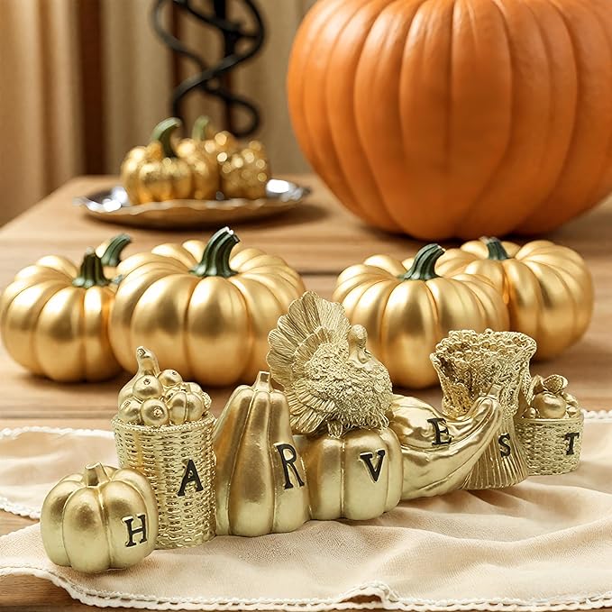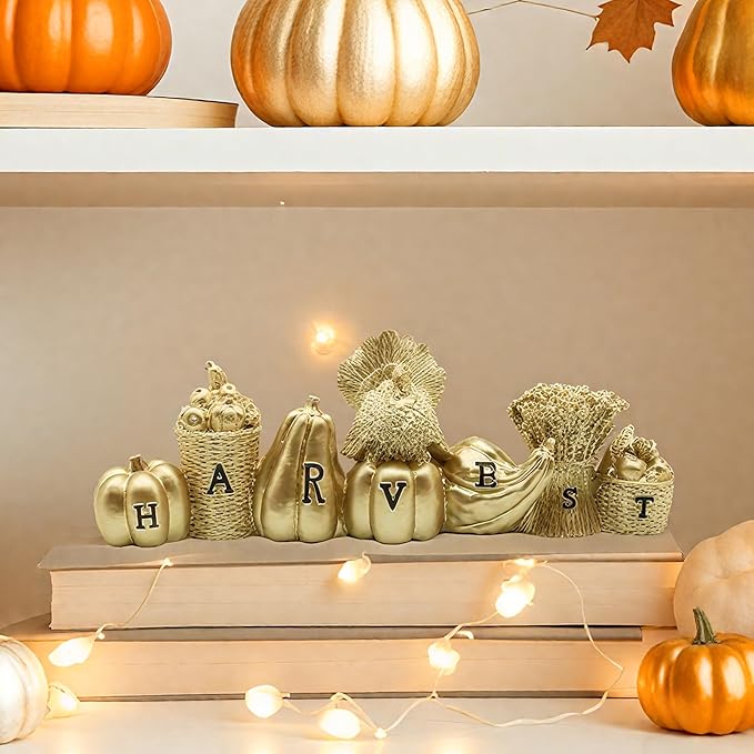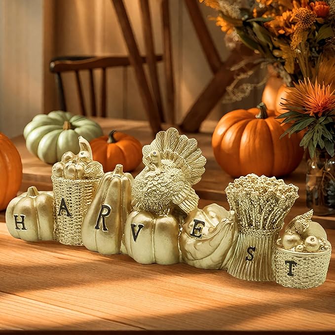 - Festive Design: The gold Harvest figurine for Thanksgiving decor features a unique combination of pumpkins, fruit baskets, turkey, and corn, along with the black carved "HARVEST" inscription, embodying greatly the classic elements of Thanksgiving, perfectly capturing the grateful and abundant spirit of harvest autumn season