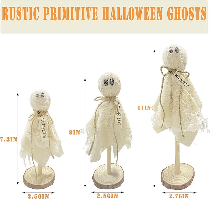 - Perfect Size: The primitive ghost set come in 3 sizes: size 1: 2.76’’Lx2.76’’Wx11’’H, size 2: 2.56’’Lx2.56’’Wx9’’H, size 3: 2.56’’Lx2.56’’Wx7.3’’H, ideal for Halloween centerpieces for table, adding a charming and spooky touch to your Halloween celebrations