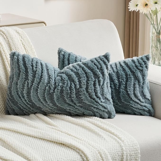 FUTEI Blue Decorative Throw Pillow Covers 12x20 Inch Set of 2,Soft Faux Fur Geometric Shapes Texture Pillowcase,Boho Home Decor for Couch Bed Living Room