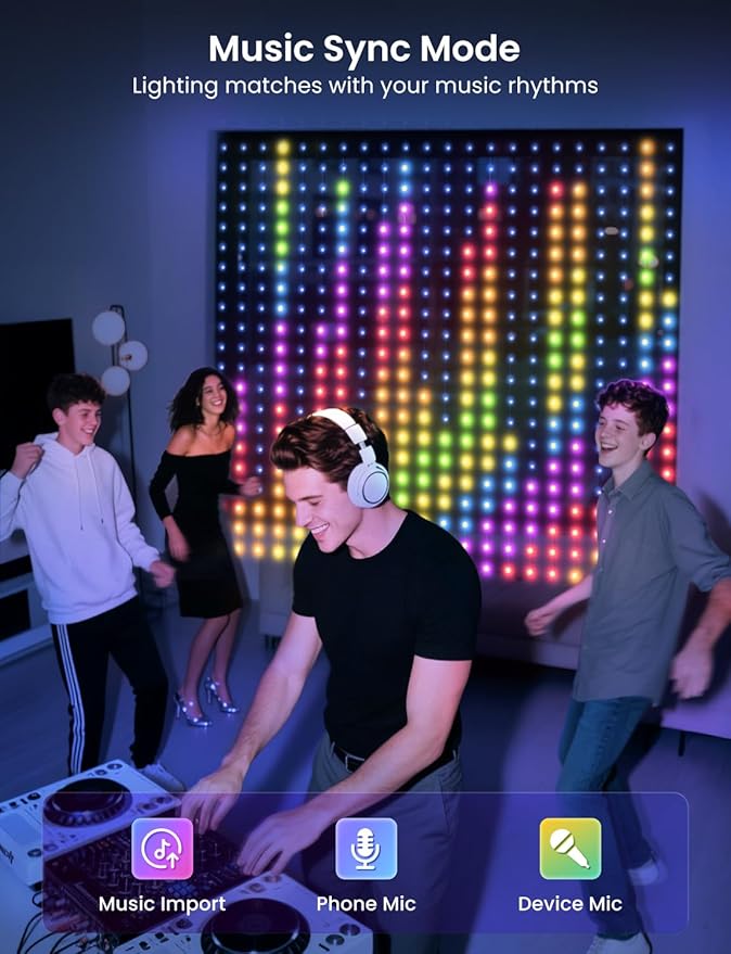 - [Music Mode & Voice Control]: 3 Music sync modes include music import mode, phone mic and device mic mode, which allow the smart curtain light to synchronize with internal music of phone, music library on APP, the ambient sound and music played by phone, displaying dynamic spectrum patterns; Programmable LED curtain light supports voice control with Alexa and Google Assistant, you can enjoy hands-free controlling the light while having a party, watching movies, playing games, etc.