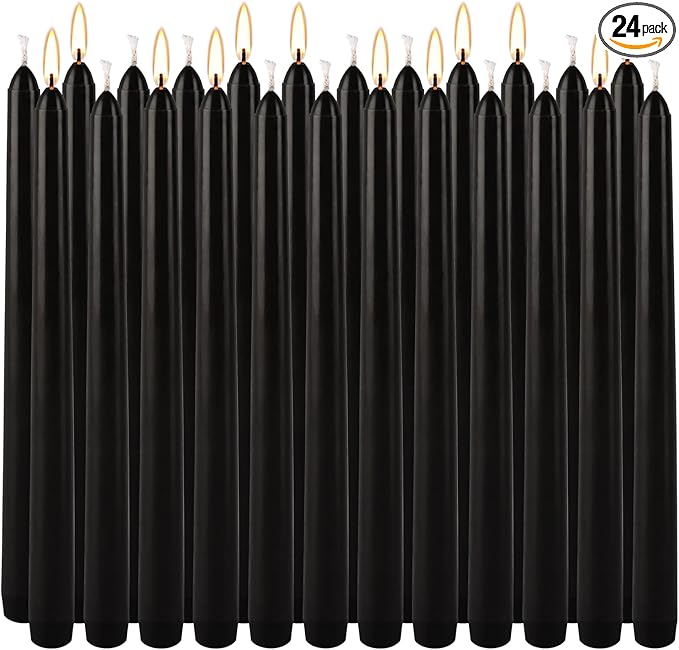 24-Pack Black Dripless Taper Candles -10 inch Tall- Cotton Wick, 7.5 Hour Clean Burning,Smokeless,Suitable for Home Decoration, Weddings, Religious Ceremonies, Holidays, Parties and Halloween.