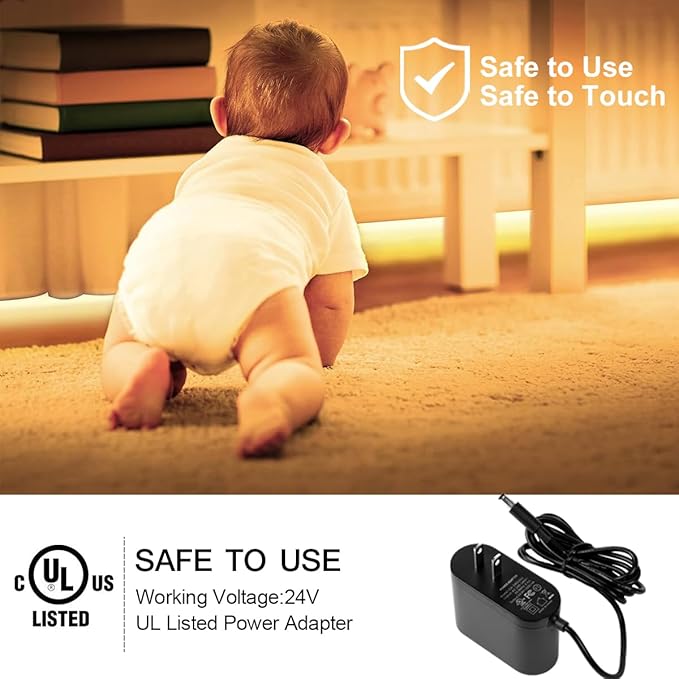 - Safe to Use: UL listed 24V power adapter, and built-in short circuit prevention technology, the led tape light strips has low heat and is incredibly safe and touchable for users. We recommend you test the lights before installation