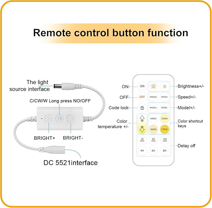 - 【Multifunction Controller】Support bluetooth2.4G remote control, smartphone APP control and one-button switch of the control box. You can use the APP to adjust the brightness/color temperature of the light strip at will, and even set the timing mode. The controller/remote control supports one-to-many control (please read the user manual for details). The memory function allows the strip light to retain its last settings when you turn on your light!