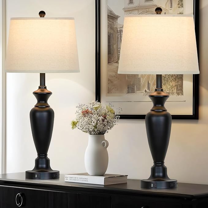 - 【Multiple Charging Ports】Each black table lamp features built-in USB-A, Type-C ports, and an AC outlet, allowing you to charge phones, tablets, and other devices simultaneously. Keep your nightstand organized and clutter-free while staying connected to your devices