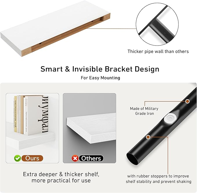 - 9 Inch Deep Design - This wall shelf measures 24"W x 9"D x 1.6"H. Extra deeper and thicker design in order to bring maximizes storage space and weight capacity, even hold up to 55 lb. This floating shelf taking up zero square feet, reduces clutter and highlights décor in compact spaces.