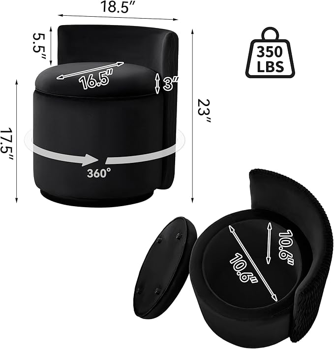 Velvet Vanity Chair with Storage, 360° Swivel Makeup Chair with Wave Back, No Assembly Small Accent Stool for Bedroom, Dressing, Living Room, Black