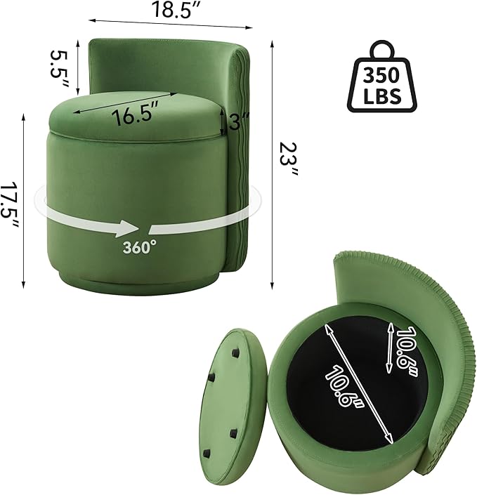 Velvet Vanity Chair with Storage, 360° Swivel Makeup Chair with Wave Back, No Assembly Small Accent Stool for Bedroom, Dressing, Living Room, Green
