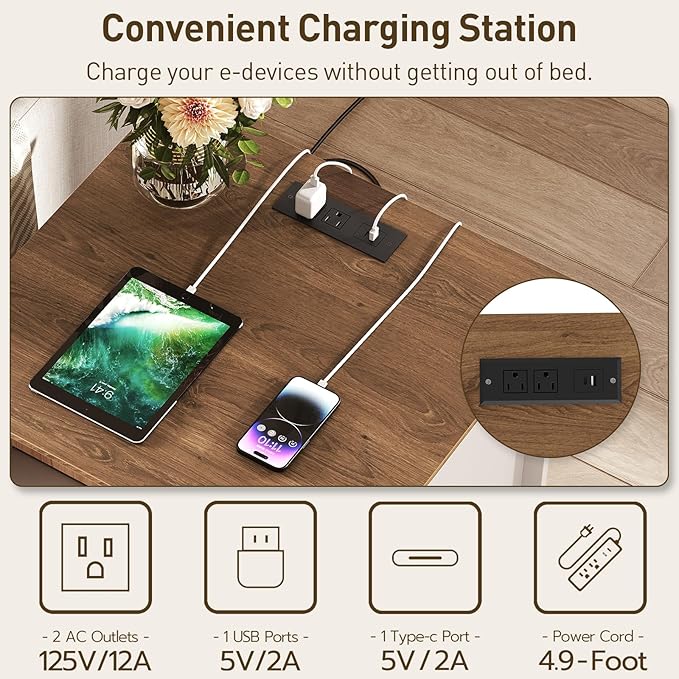 - Handy Charging Station: The farmhouse end table features an built-in power strip with 2 AC outlets, 1 USB, and 1 Type-C port, allowing you to charge lamps, phones, laptops, and more without leaving your bed. The cord management hole keeps cables organized
