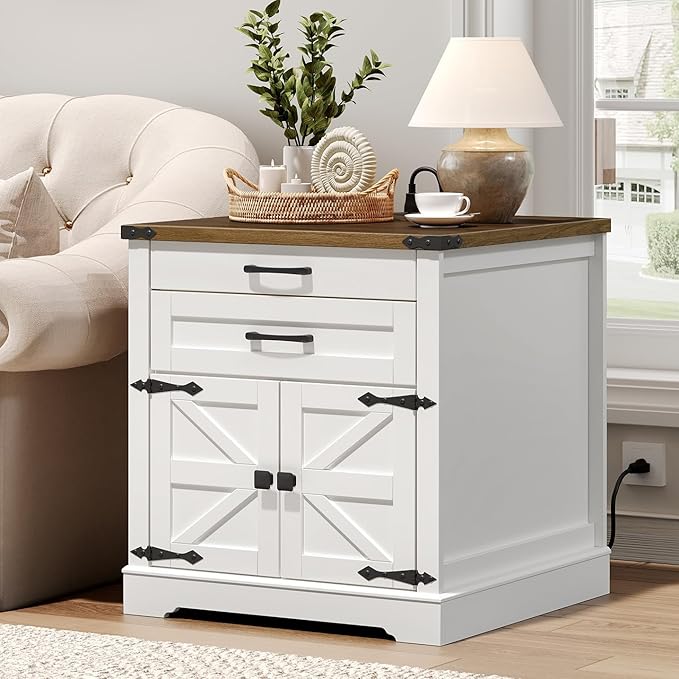 Farmhouse End Table with Charging Station, 24'' Sofa Side Table with 2 Drawers and Barn Door, Large Rustic Wooden Square Nightstand for Bedroom, Living Room, White and Walnut