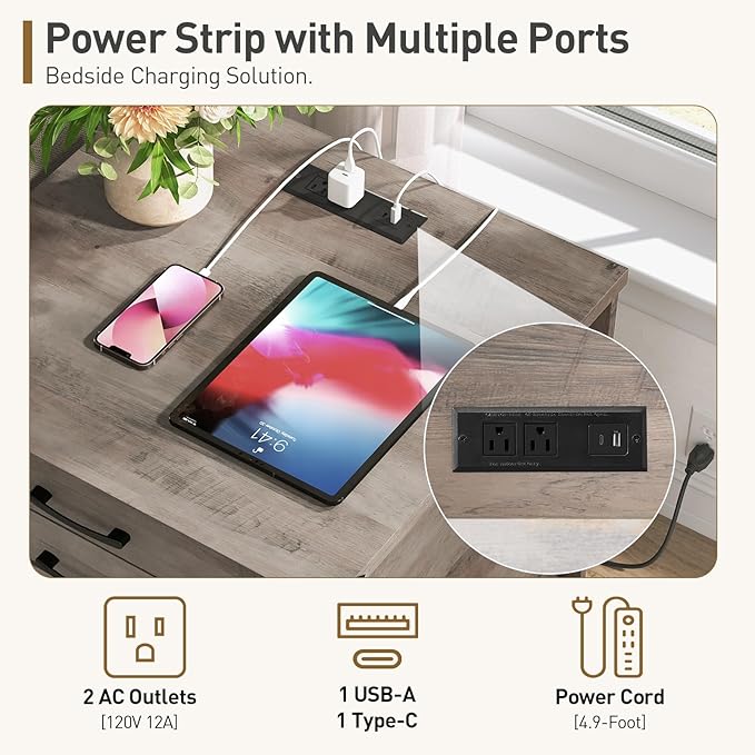 - Versatile Power Outlet: With 2 AC outlets, 1 USB-A, and 1 Type-C port, this bedside table is convenient for charging lamps, phones, tablets, etc. Say goodbye to the hassle of insufficient bedside outlets; charge multiple devices easily