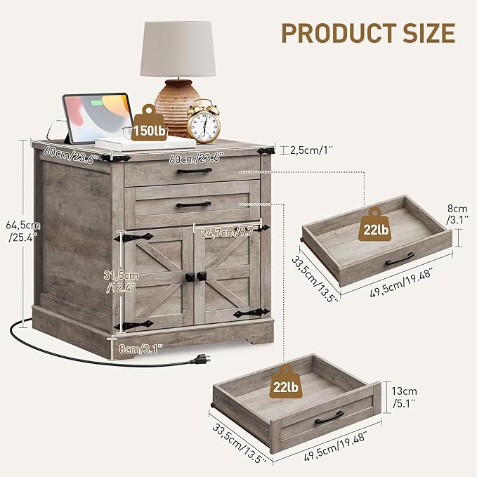 - Large Capacity Storage: This 23.6"L x 23.6"W x 25.4"H Farmhouse end Table offers a spacious square tabletop perfect for placing lamps and glasses. Two deep drawers provide ample space for bedtime magazines and a cabinet with framed doors for bedside odds and ends
