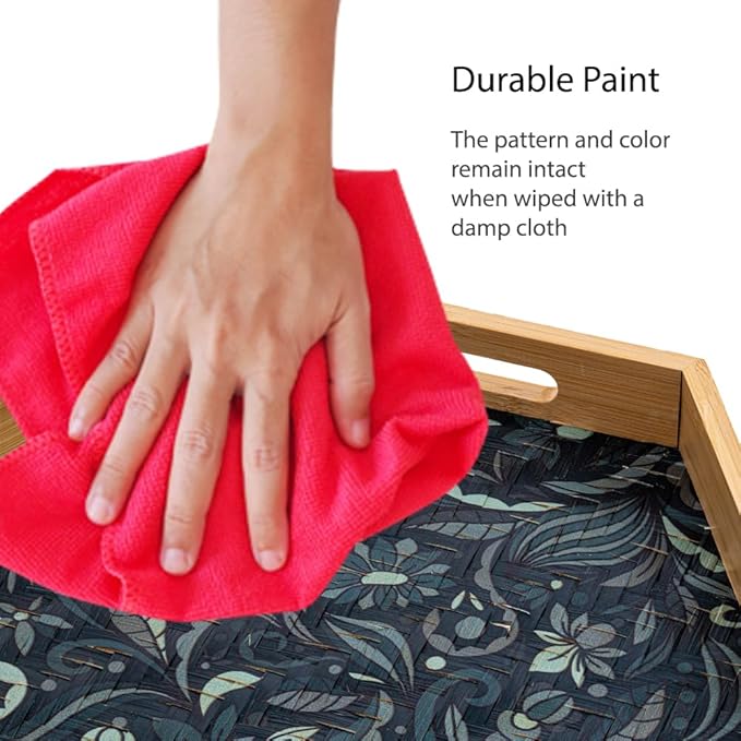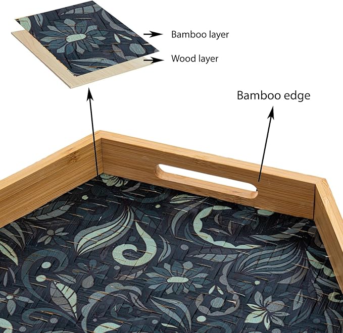 - [DIMENSION & MATERIALS] 12.7”L x 15.7”W hexagonal tray. Made of bamboo, the tray edge is bamboo wood, the tray surface is woven by the bambo strips, backed by wood bottom. The pattern is printed on bamboo surface.