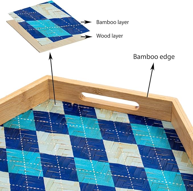 - [DIMENSION & MATERIALS] 12.7”L x 15.7”W hexagonal tray. Made of bamboo, the tray edge is bamboo wood, the tray surface is woven by the bambo strips, backed by wood bottom. The pattern is printed on bamboo surface.