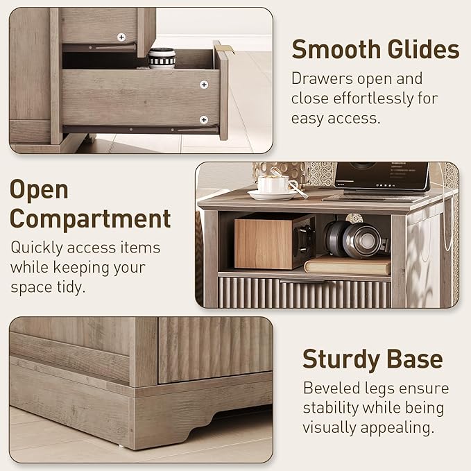 - Farmhouse Style Appeal: Boasting a greige finish, this side table exudes farmhouse charm. Its drawer front with wavy grooves adds a touch of simplicity and artistry, blending seamlessly into country, modern, farmhouse, or casual styles