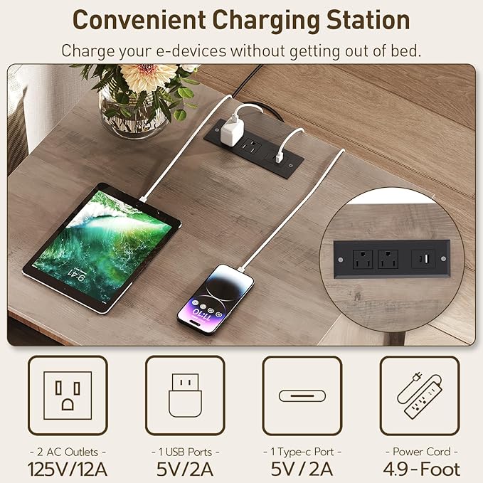 - Handy Charging Station: The farmhouse end table features an built-in power strip with 2 AC outlets, 1 USB, and 1 Type-C port, allowing you to charge lamps, phones, laptops, and more without leaving your bed. The cord management hole keeps cables organized