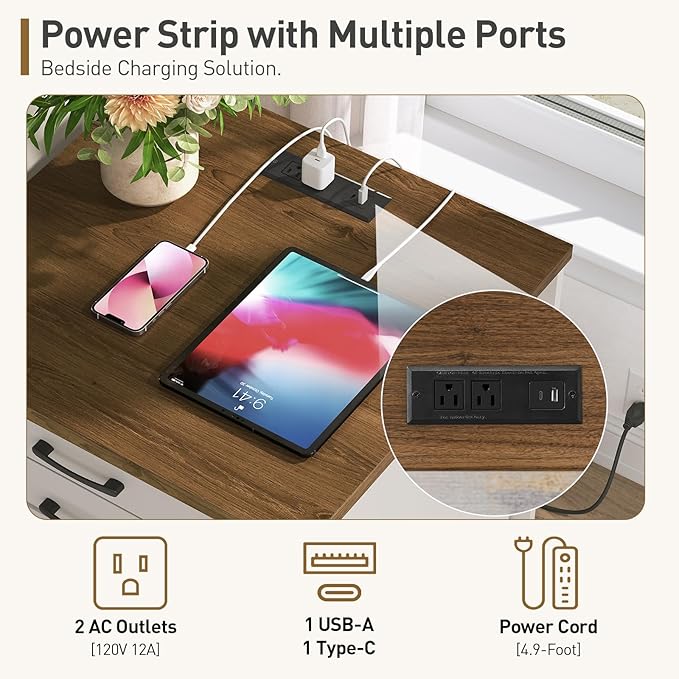 - Versatile Power Outlet: With 2 AC outlets, 1 USB-A, and 1 Type-C port, this bedside table is convenient for charging lamps, phones, tablets, etc. Say goodbye to the hassle of insufficient bedside outlets; charge multiple devices easily