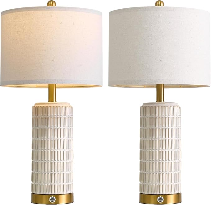 PoKat Touch Bedside Table Lamps with USB Ports for Bedroom, 25'' Dimmable Nightstand Touch Lamps for Living Room, Modern Ceramic Lamps for Night Stands Bedroom, Office, Nursery, White and Beige