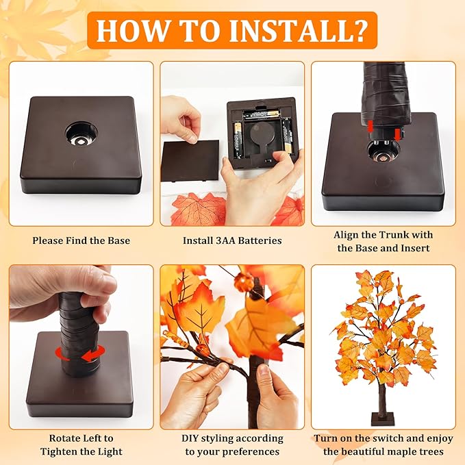 - 【Timer & Energy conservation】Each lighted fall Thanksgiving decorations has a timing device on the base, requires 3*AA batteries (not included). maple tree lights that turn on the timer function will turn off automatically after 6 hours and turn back on after 18 hours. easy to automatically open/close,save electricity and safety.