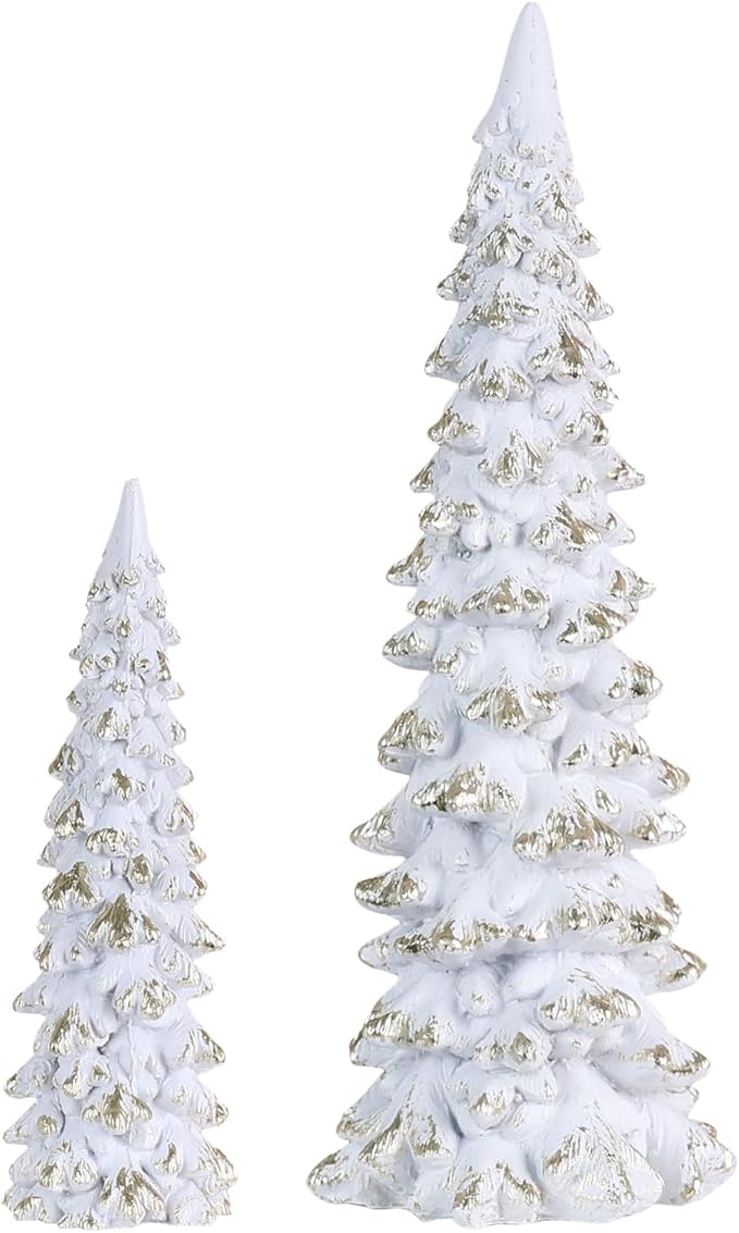 - 🎄【FROSTED WHITE RESIN CHRISTMAS TREES】 Bring the enchantment of a snow-kissed winter indoors with this elegant 2-piece resin Christmas tree set in glistening white. The trees feature delicate gold-accented tips that create a luxurious frost-meets-glamour effect, perfect for capturing that magical holiday atmosphere. Display them as a sparkling part for a cohesive winter wonderland.