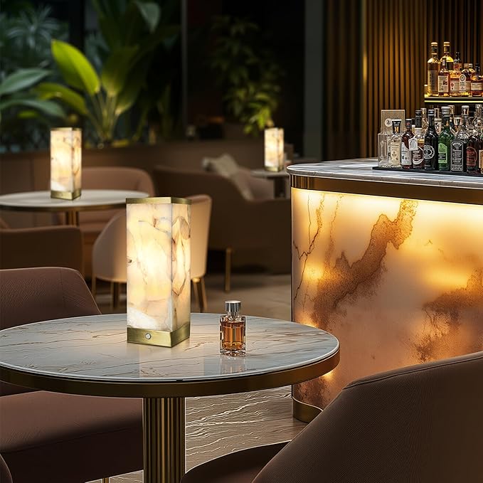 - MINIMALIST DESIGN, DISTINCTIVE LOOK: Cordless table lamp, the lamp body is square, simple to create the generous desk lamp. Natural alabaster material with textures, and gold metal table lamp base, two different hues add warmth and richness to the beautifully textured lamp, great ambiance lighting.